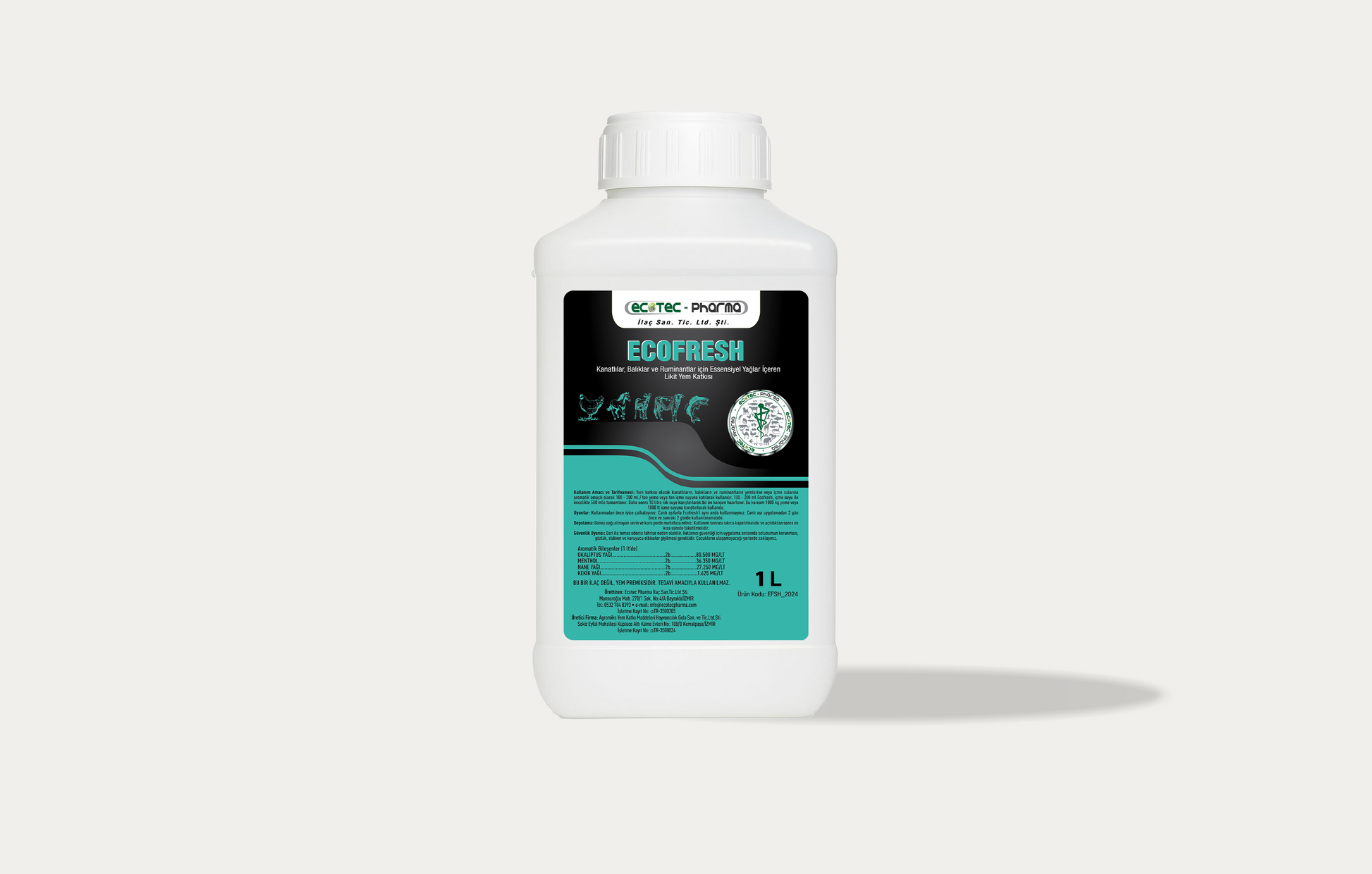 100-200 ml Ecofresh, içme suyu ile öncelikle 500 ml’ye tamamlanır. Ardından 10 litre ılık su ile karıştırılarak bir ön karışım hazırlanır. Bu karışım, 1000 kg yeme veya 1000 litre içme suyuna eşit şekilde dağıtılarak kullanılır.